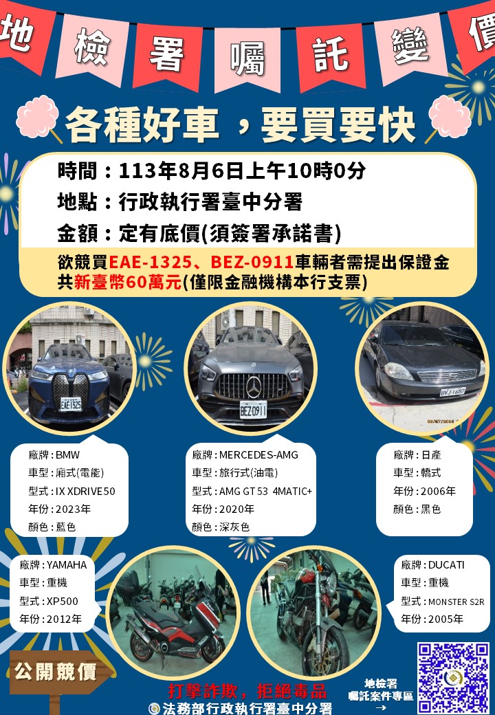法務部為強化打擊詐欺犯罪,儘速將偵查中扣押物變價、剝奪詐騙集團犯罪所得,由各地檢署囑託行政執行署各分署執行犯罪所得購買之物品進行變價。臺中分署特於8月6日上午9時30分至12時舉辦「大墩公義市集」,擴大辦理123聯合拍賣會暨善心好物義賣活動;此次拍賣物品即包括臺中地檢署因偵辦詐騙案件而囑託變價之2023年份BMW純電休旅車IX 1輛、2020年份賓士MERCEDES- Benz AMG GT53 1輛、2005年份DUCATI重機803C.C 1輛、2012年份YAMAHA 重機530C.C 1輛、2006年份日產轎車1998C.C 1輛